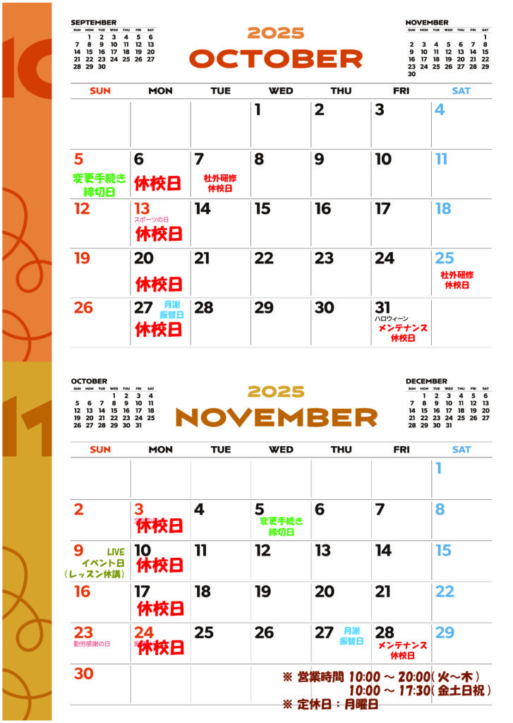 2025年10~11月営業カレンダー